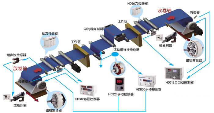 張力控制系統(tǒng)可以對紙張、膠片、薄膜、電線電纜、橡膠等材料在收放卷時的材料提供該性能張力控制。對材料卷繞過程中材料的兩邊不整齊提供糾偏功能。