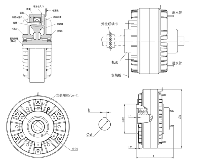 FZKY型空心軸、止口支撐、水冷磁粉制動器 額定轉矩100~1000N.m,轉速:250~1500,冷卻方式分為單水冷,如果需要在FZKY產品上加裝機座,訂貨時請聲明。